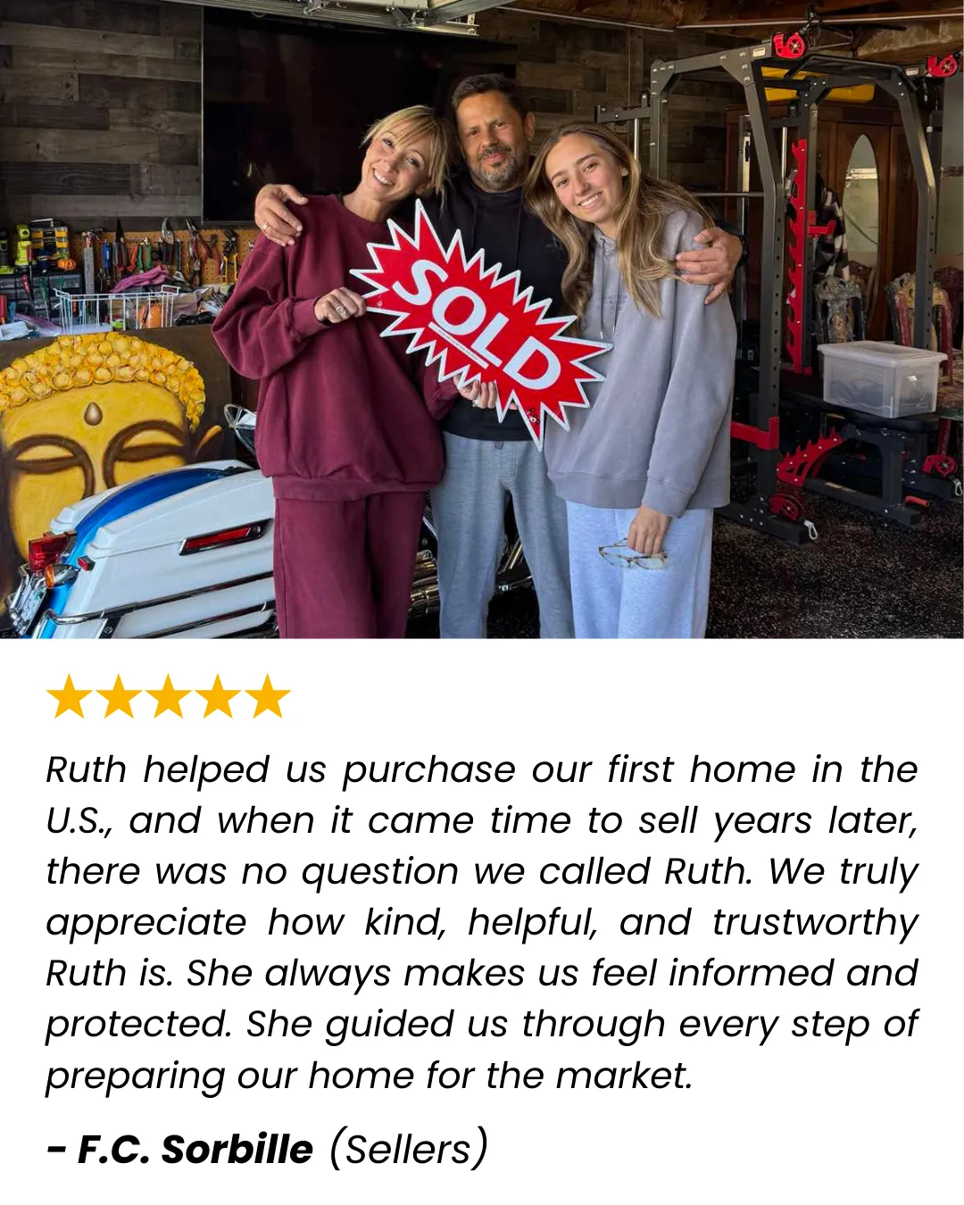 We met Ruth at an open house in Irvine six years ago, and we’re so glad we did! She helped us purchase our first home in the U.S., and when it came time to sell years later, there was no question we called Ruth. We truly appreciate how kind, helpful, and trustworthy Ruth is. She always makes us feel informed and protected. She guided us through every step of preparing our home for the market, and her daily communication made the entire escrow process smooth and stress-free.If you're thinking about selling or buying in Irvine or Orange County, we highly recommend Ruth and her amazing team at Ruth Bruno Real Estate. She’s simply the best! 💛