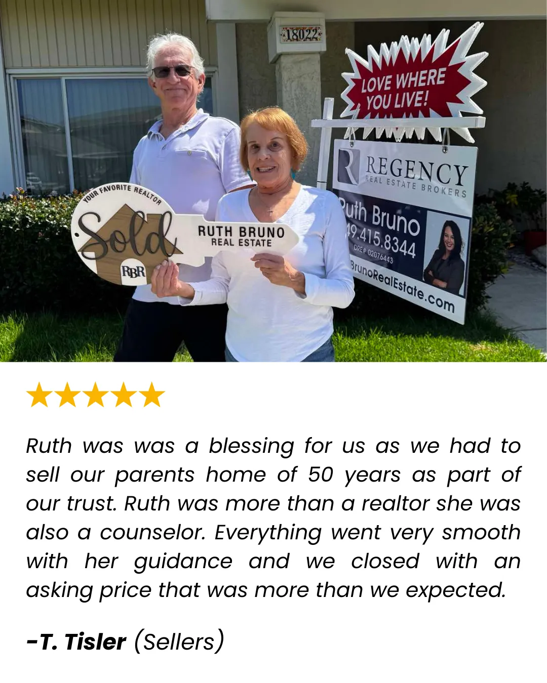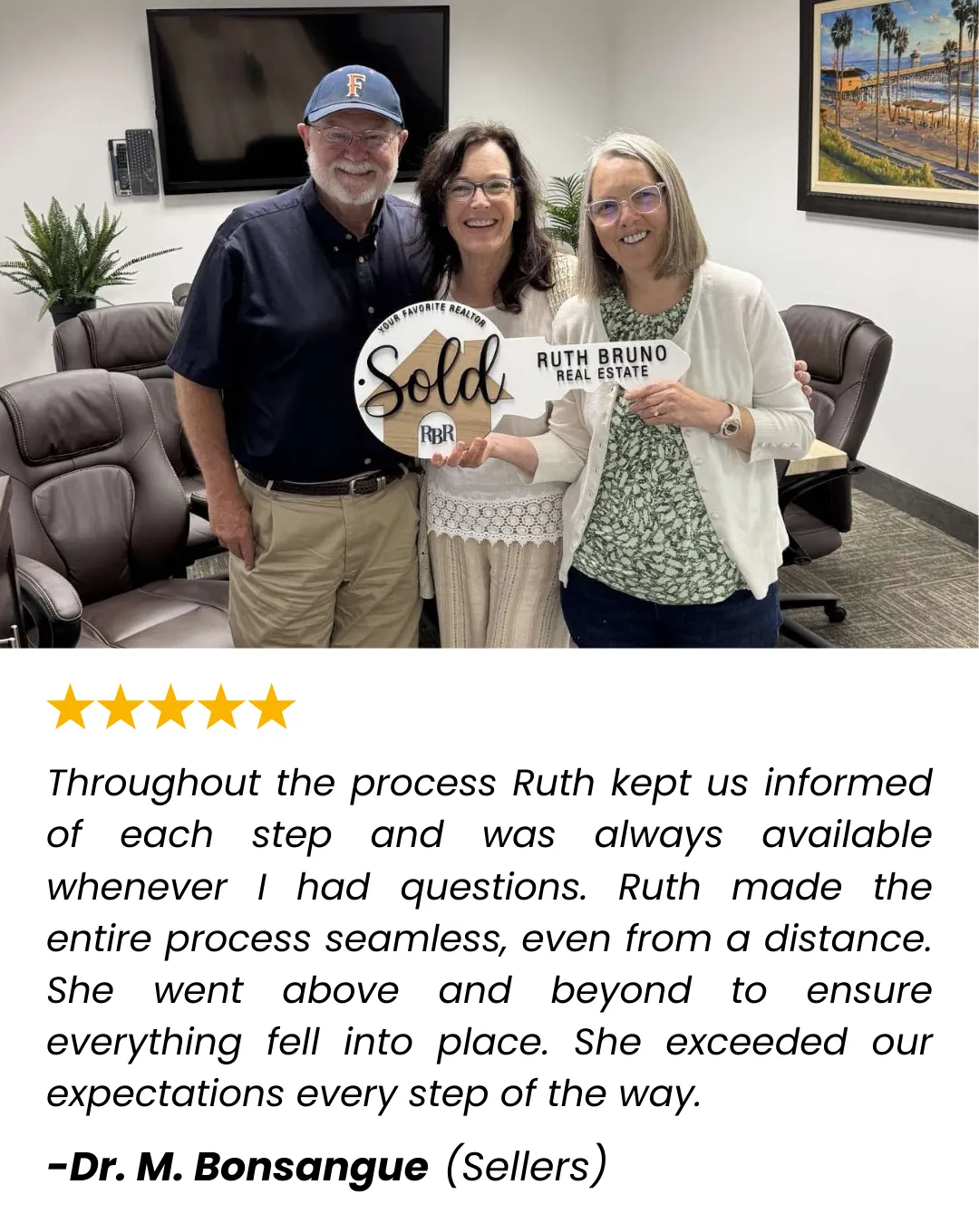 Most recently, Ruth managed the sale of our home in North Tustin. She seamlessly coordinated every aspect, from organizing an estate sale and overseeing pre-listing repairs with her reliable handyman, to expertly handling cleaning, staging, and managing all offers. Ruth's professionalism, attention to detail, and genuine care for her clients make her an outstanding real estate advisor. If you're considering buying or selling a home in Orange County, we wholeheartedly recommend reaching out to Ruth Bruno Real Estate.